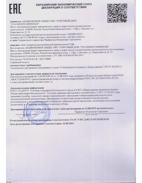Сертификат Сепаратор СЦВ с ТУ